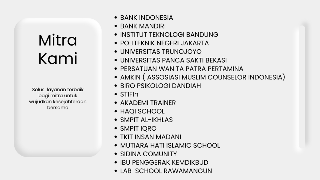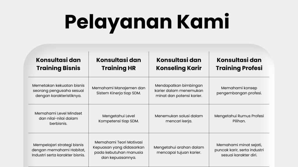 Menyediakan layanan konsultasi personal, manajemen, maupun lembaga.