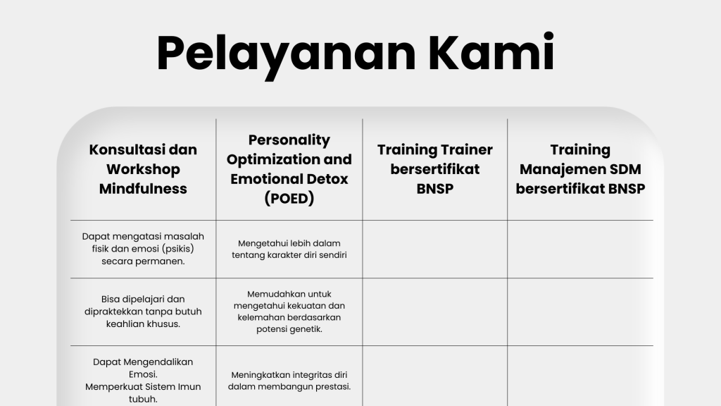 Selaku Perusahaan yang bergerak dalam bidang pendidikan, pelatihan SDM, konsultan pendidikan, perdagangan umum, konseling dan personal development, kami hadir untuk bersinergi dalamprogram membangunkaraktermenujuInsanSuksesmulia.