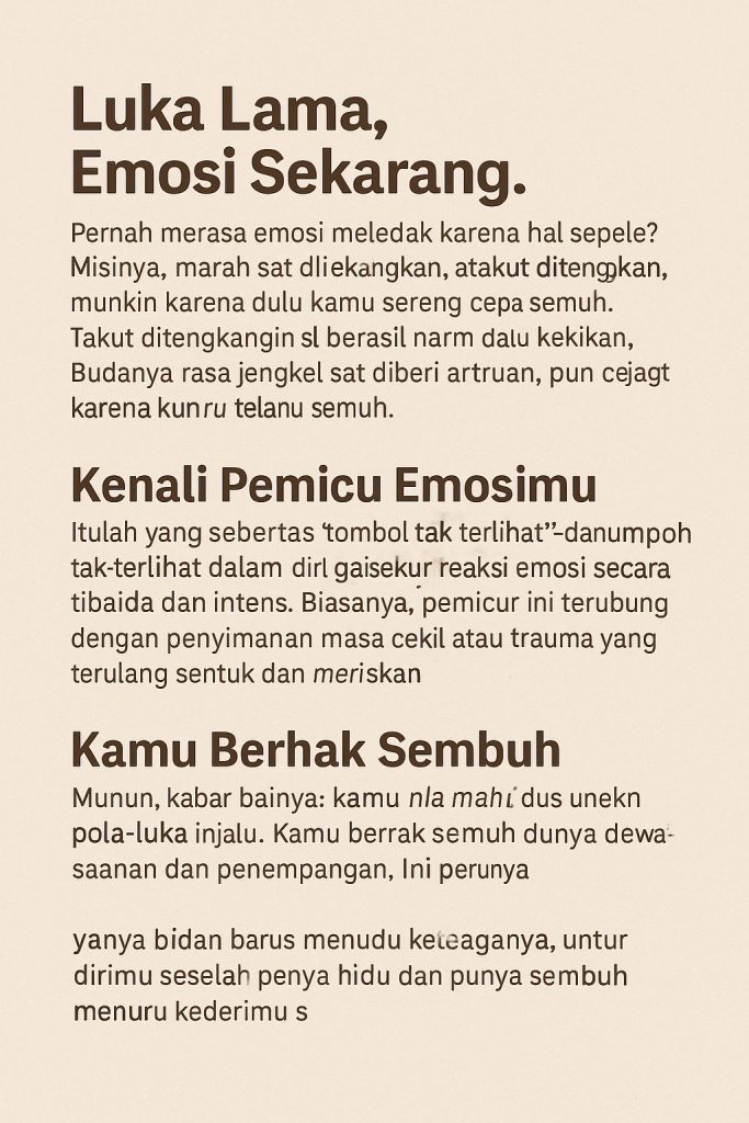 Namun, kabar baiknya: kamu tidak harus terus hidup dalam pola lama itu. Kamu berhak sembuh dari luka-luka masa lalu. Berhak merasa aman, dicintai tanpa syarat, dan cukup—tanpa harus membuktikan apa-apa. Memahami pemicu emosi bukan berarti kamu lemah, justru itu langkah awal menuju kedewasaan emosional dan penyembuhan. Ini perjalanan panjang, tapi kamu tidak sendiri. Dan kamu pantas punya hidup yang lebih damai, untuk dirimu sendiri.