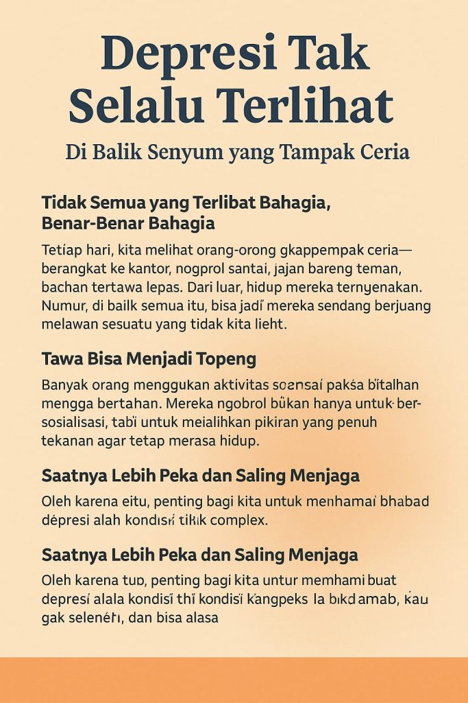 Setiap hari, kita melihat orang-orang yang tampak ceria—berangkat ke kantor, ngobrol santai, jajan bareng teman, bahkan tertawa lepas. Dari luar, hidup mereka terlihat menyenangkan. Namun, di balik semua itu, bisa jadi mereka sedang berjuang melawan sesuatu yang tidak kita lihat. Karena faktanya, depresi tidak selalu tampak dalam bentuk kesedihan atau keterpurukan yang jelas.