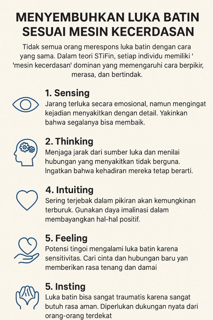 Tidak semua orang merespons luka batin dengan cara yang sama. Dalam teori STIFIn, setiap individu memiliki “mesin kecerdasan” dominan yang memengaruhi cara berpikir, merasa, dan bertindak. Oleh karena itu, memahami karakteristik masing-masing mesin bisa membantu kita atau orang terdekat untuk menyembuhkan luka dengan cara yang lebih tepat dan efektif.