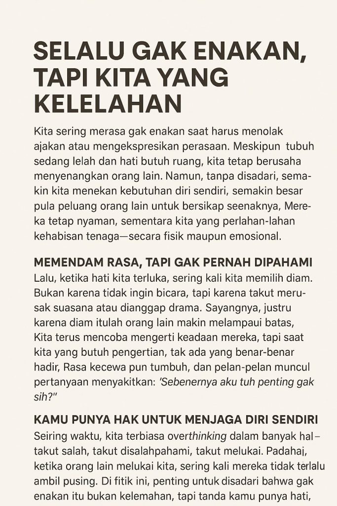Seiring waktu, kita terbiasa overthinking dalam banyak hal—takut salah, takut disalahpahami, takut melukai. Padahal, ketika orang lain melukai kita, sering kali mereka tidak terlalu ambil pusing. Di titik ini, penting untuk disadari bahwa gak enakan itu bukan kelemahan, tapi tanda kamu punya hati. Namun, kamu juga punya hak untuk menetapkan batas. Pelan-pelan, belajarlah untuk bilang “nggak” demi menjaga dirimu sendiri. Karena kamu juga layak diperjuangkan—bukan cuma terus mengalah.