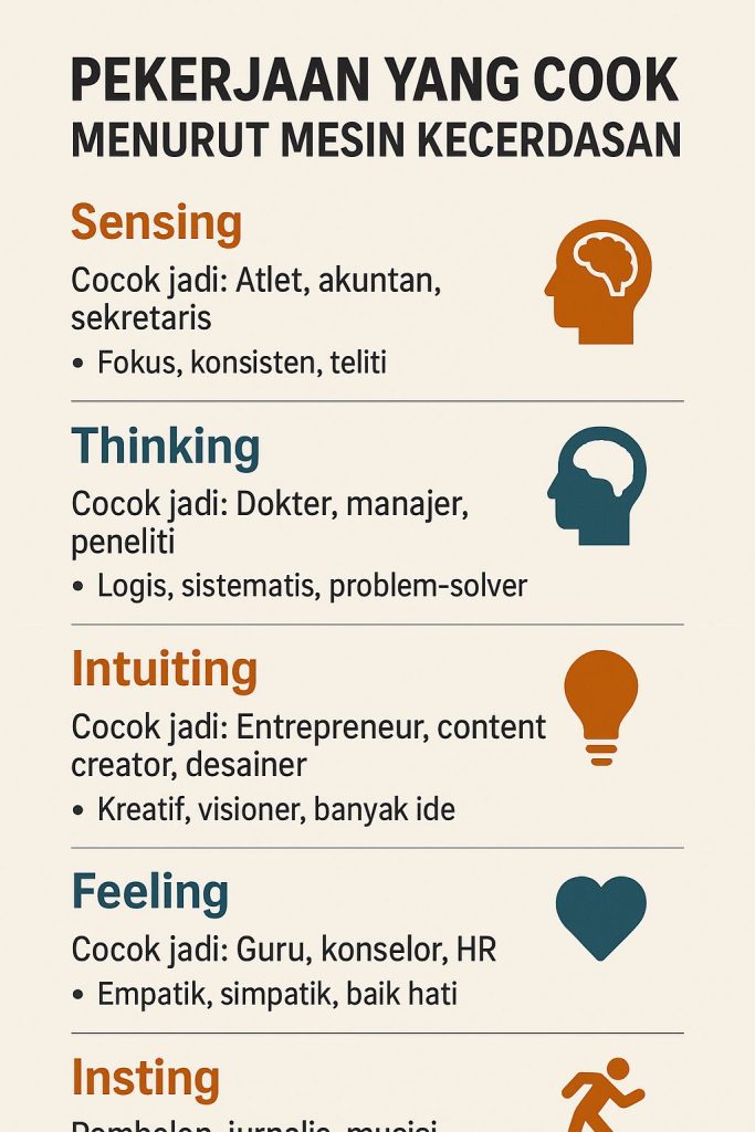 Tidak semua orang cocok dengan pekerjaan yang sama. Setiap individu memiliki cara berpikir, merasakan, dan mengambil keputusan yang berbeda—itulah yang disebut sebagai mesin kecerdasan. Ketika seseorang memahami bagaimana dirinya bekerja, ia bisa memilih jalur karier yang sesuai dengan kekuatan alaminya. Misalnya, tipe Sensing yang fokus dan teliti sangat cocok dengan pekerjaan seperti atlet, akuntan, atau sekretaris yang membutuhkan konsistensi dan perhatian terhadap detail.