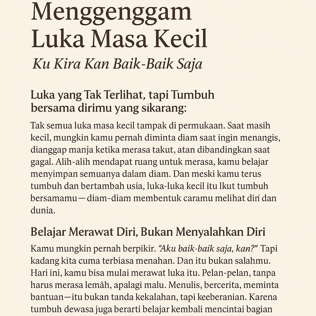 Kamu mungkin pernah berpikir: “Aku baik-baik saja, kan?” Tapi kadang kita cuma terbiasa menahan. Dan itu bukan salahmu. Hari ini, kamu bisa mulai merawat luka itu. Pelan-pelan, tanpa harus merasa lemah, apalagi malu. Menulis, bercerita, meminta bantuan—itu bukan tanda kekalahan, tapi keberanian. Karena tumbuh dewasa juga berarti belajar kembali mencintai bagian dirimu yang dulu tidak sempat didengar.